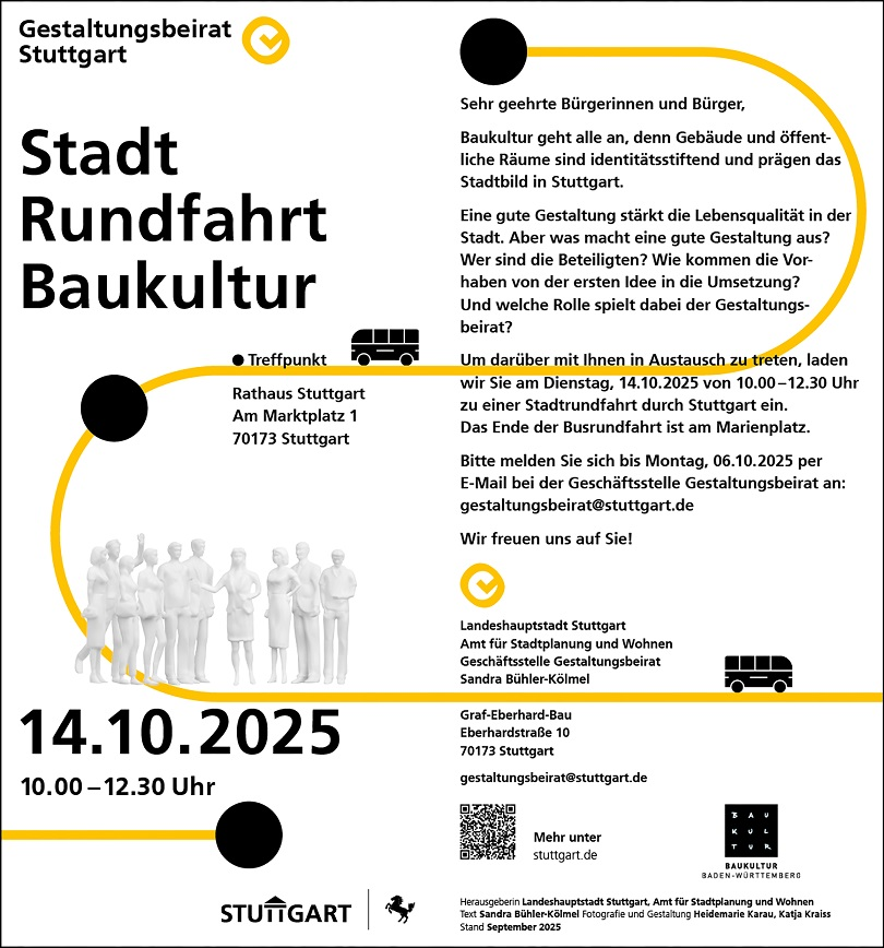 Anmeldung bis Montag, 6.10.2025 per e-mail an die Geschäftsstelle Gestaltungsbeirat: gestaltungsbeirat@stuttgart.de