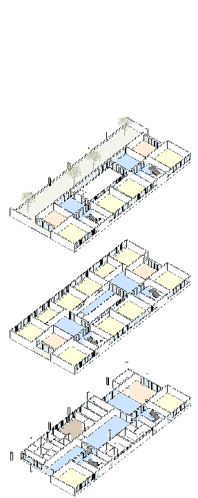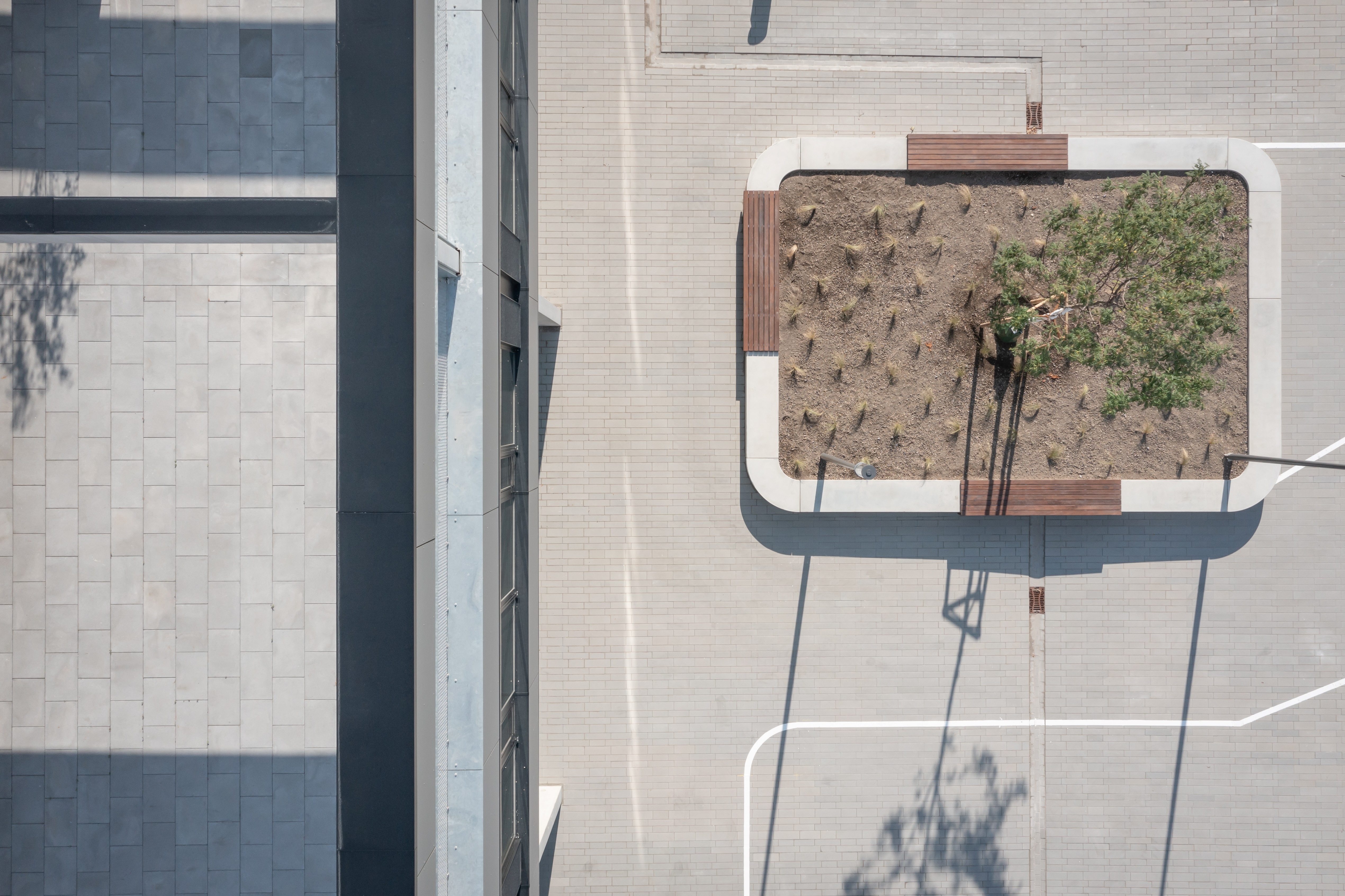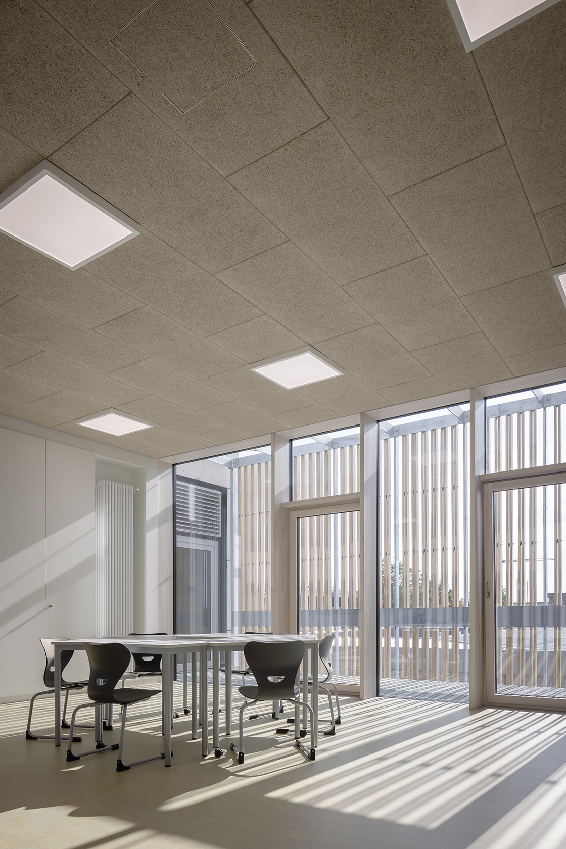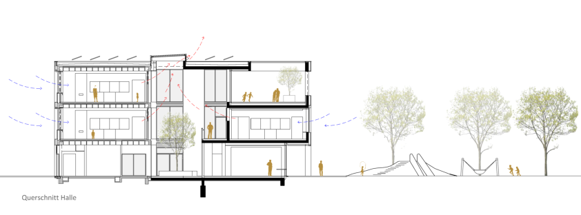 Es entstand ein dreigeschossiger Klassenneubau sowie eine zentrale, glasüberdeckte Halle, welche als U-förmiger Anbau das bestehende Gebäude ergänzt und eine Verbindung von Alt und Neu schafft. Hierdurch konnte eine zweiseitige Belichtung für den Anbau und die innenliegenden Klassen sowie die Möglichkeit der Querlüftung über die Thermik der Halle geschaffen werden. An den Stirnseiten entstanden Sondernutzungen (Küche, Musikraum, Multifunktionsraum) und auf dem Neubau eine Dachterrasse. Im Bestand wurde die Betonkonstruktion aufgebessert und die ursprüngliche Haptik wiederhergestellt. Der bestehende Eiche-Industrie-Parkettboden wurde aufgearbeitet und die Betonsitzbänke im Flur erhalten. Insgesamt wurde ein Low-Tech-Infrastrukturkonzept mithilfe eines Verzichts auf eine Lüftungsanlage, durch Anschluss an Nahwärme, Nutzung des extensiv begrünten Dachs durch Photovoltaik sowie die hochwertige Dämmung aller Außenbauteile verfolgt. Weitere drei Gebäude auf dem Gelände sind derzeit noch ungenutzt und werden als Reserve für künftige Umgestaltungen verstanden.